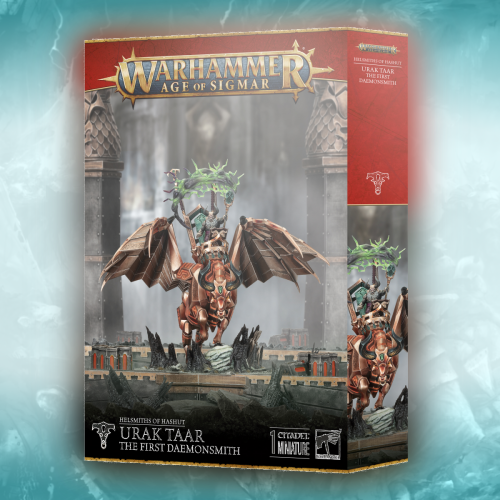 This multipart plastic kit builds Urak Taar, mounted on his Infernal Taurus, Ghorrakos. As the first and greatest Daemonsmith, he is the ultimate leader for your Helsmiths of Hashut armies in games of Warhammer Age of Sigmar. Urak Taar is an absolute terror on the battlefield, lashing out with spells even while his mount grinds his foes into the earth under its metal hooves and gores them with long horns. Standing at 144mm tall with a wingspan of 193mm, this darkly majestic miniature towers over your army. As well as dominating on the tabletop, its stunning details, including stone-cursed flesh, runes, and gems, make for a true test of your painting skills. Taar can be assembled with or without ruinous torrents on his staff.