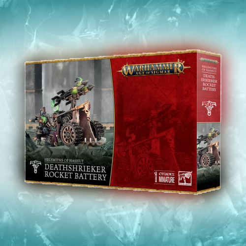 This multipart plastic kit builds a Deathshrieker Rocket Battery, a terrifying siege engine for your Helsmiths of Hashut armies in games Warhammer Age of Sigmar. Ingeniously designed by the chaos-touched duardin, these rockets fuse daemonic energies with potent warheads, capable of taking down even the largest targets. The kit includes two duardin and a hobgrot to crew your devastating war engine, which is adorned with Hashutite runes and the bull motif, making for an excellent painting project.