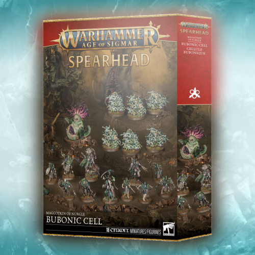 Grandfather Nurgle calls you to war, and this box is an ideal way to start a new Maggotkin of Nurgle collection – or expand an existing army – and save money compared to buying the kits individually. This army is led by a Rotbringer Sorcerer, wielding the putrefying magic of their patron. The bulk of the army comprises a cult of the Rotmire Creed, mortal followers who seek to expand the reach of Nurgle's contagions. A sizeable contingent of Nurglings is along for the ride. These capering daemonic hosts are hard to kill, making them ideal for holding vital objectives. An eager Beast of Nurgle backs everything up, ready to take on your largest foes. These miniatures comprise a complete Spearhead force, meaning you're ready to jump into tight, tactical games and drown the Mortal Realms in rivers of filth right out of the box.