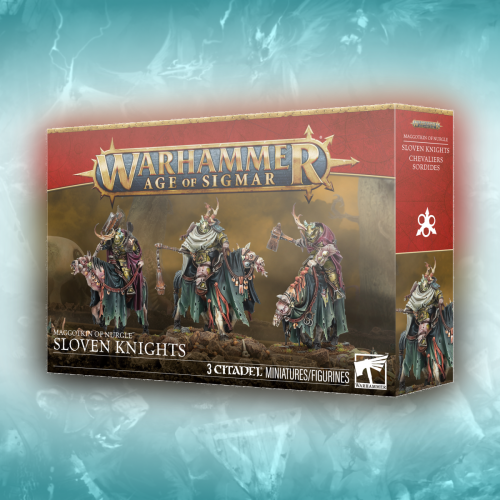 This multipart plastic kit builds three Sloven Knights, elite cavalry for your Maggotkin of Nurgle armies in games of Warhammer Age of Sigmar. Riding mutated, foetid nags, they can respond quickly to changes in the battle and get to grips with the enemy faster than your infantry. Rather than the noble lances they once carried, they are now armed with entropic bludgeons – brutal weapons that make a mockery of enemy armour. The kit includes five interchangeable heads – including one that makes an optional champion – and another head that can be used on two of the Sloven Knights, offering a degree of customisation to your twisted cavalry.