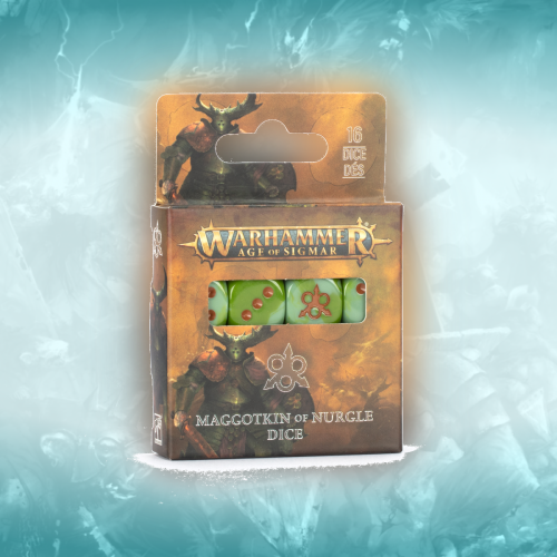 This is a set of 16 six-sided dice with rounded edges for use in games of Warhammer Age of Sigmar, themed around the Maggotkin of Nurgle. They are cast in swirled pale green acrylic plastic with brown ink markings and measure 16mm along each edge. The 1-5 facings are traditionally pipped, and each '6' face is decorated with the bubonic icon of the Maggotkin of Nurgle. These themed dice are only available while stocks last.