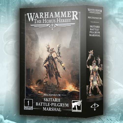 This multipart plastic kit builds a Skitarii Battle-Pilgrym Marshal, an experienced leader for your Skitarii Conclave armies in games of Warhammer: The Horus Heresy. They are formidable warriors in their own right, able to lead a Skitarii force from the front. As befits their position, they have access to the holiest of weaponry. They can be armed with a voltlock handgun or archaeotech pistol, and a phase claw, corposant stave, or auctorit sceptre, giving them the tools to take on any foe. The miniature also comes with two optional servo-skulls and a choice of three heads – hooded, bare, and helmeted with a crest – making it easy to customise your Marshal.