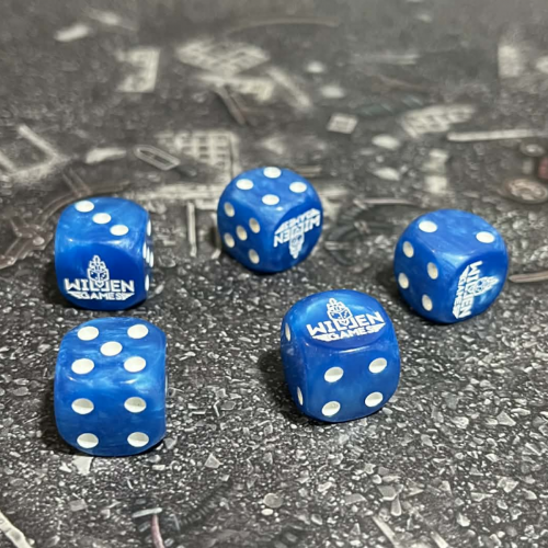 Show some love for your favourite FLGS with our very own dice!! This pack of 5x 16mm Dice have our logo etched on the 6 and are a Marbled Blue colour with White Pips!