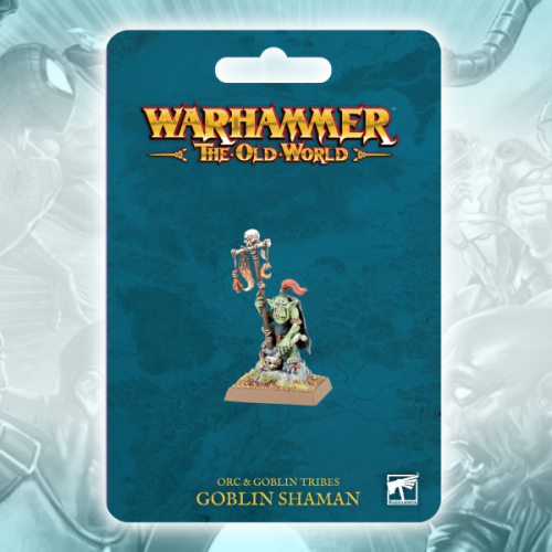 This multipart plastic kit builds one Goblin Shaman, a diminutive but powerful wizard of the Orc & Goblin Tribes. The Shaman's skull-tipped staff is strung with arcane trinkets, perfect for channeling the power of Mork (or possibly Gork). He's posed atop a mushroom-studded rock, hunched over a mystical mortar and pestle made from the remains of an unfortunate 'umie victim.
