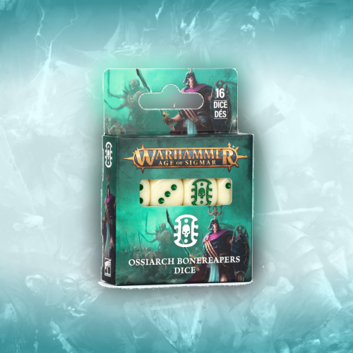 This is a set of 16 six-sided dice with rounded edges for use in games of Warhammer Age of Sigmar, themed around the Ossiarch Bonereapers. They are cast in ivory marble-effect acrylic plastic with green ink markings, and measure 16mm along each edge. The 1-5 facings are traditionally pipped, and each '6' face is decorated with the lifeless icon of the Ossiarch Bonereapers. These themed dice are only available while stocks last.