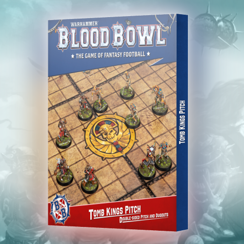 This set contains a double-sided, fold-out card Blood Bowl pitch depicting the home stadium of a Tomb Kings team. One side features an expansive, royal room within the ancient tomb of a Nehekharan of high standing, transformed into a pitch. The other side shows what happens when the Nehekharan noble is awoken from their slumber by all the ruckus.