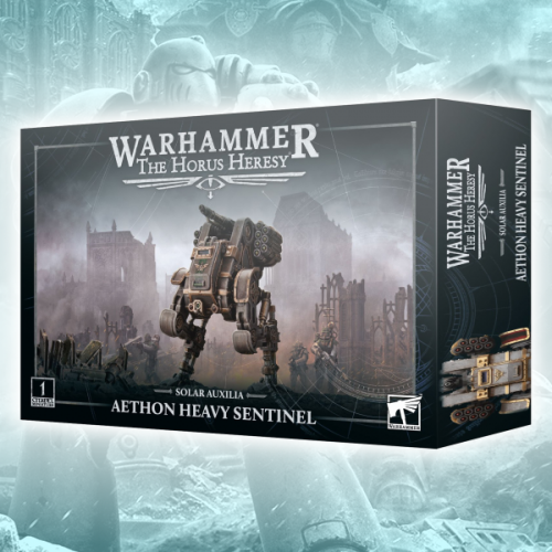 This multipart plastic kit builds one Aethon Heavy Sentinel, an armoured combat walker for the Solar Auxilia. The Sentinel comes with an arsenal of heavy weaponry, and can be armed with one of six dorsal guns – a volkite culverin, autocannon, heavy incinerator, lascannon, multi-laser, or a melta lance. It also features paired ordnance systems on its sides – either an Aethon missile battery, or a set of four hunter-killer missiles.