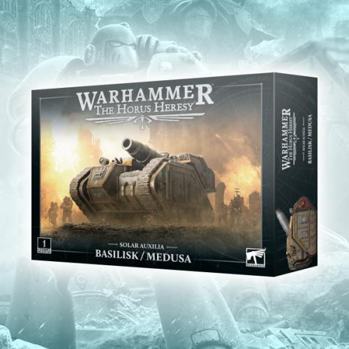 This multipart plastic kit builds one Solar Auxilia Basilisk or Medusa, an armoured artillery tank mounted with a powerful siege gun. The Basilisk's long-barrelled Earthshaker cannon hurls explosive shells across incredible distances, while the Medusa's mortar fires munitions heavy enough to shatter mighty walls. The tank has a fully detailed interior, and the rear door and roof can be opened to reveal two crew loading its siege gun. Both the gun and rear door feature glueless assembly options, allowing you to adjust their positions mid-game.