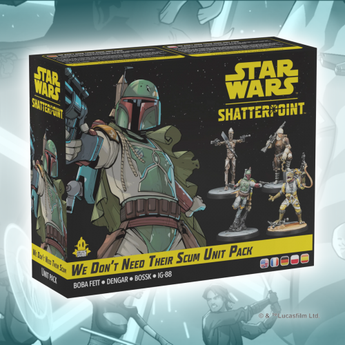 The We Don’t Need Their Scum Unit Pack brings the infamous Bounty Hunters to Star Wars™: Shatterpoint! Embrace the thrill of the hunt with these fan-favorite characters Boba Fett, Bossk, Dengar, and IG-88 in this brand new unit pack.